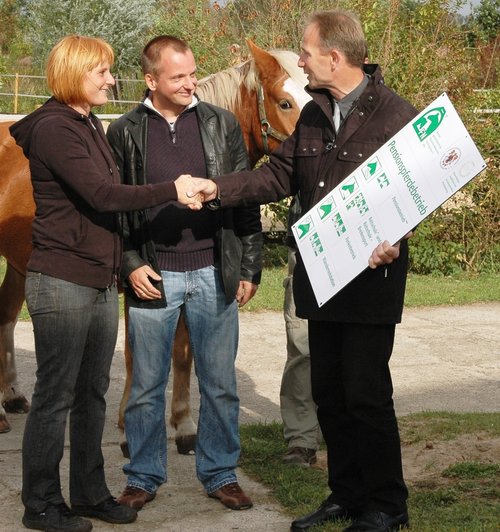 „Wir freuen uns immer sehr, wenn Pferdebetriebe an der Qualitäts-Kennzeichung der FN teilnehmen, uns ihr individuelles Betriebskonzept vorstellen und letztlich die beantragte Zertifizierung vergeben werden kann.“, so Peter Fröhlich, Geschäftsführer des Landesverbandes Pferdesport Berlin-Brandenburg bei der Auszeichnung. Peter Fröhlich stand persönlich der Prüfungskommission auf Hof Grüneberg vor.